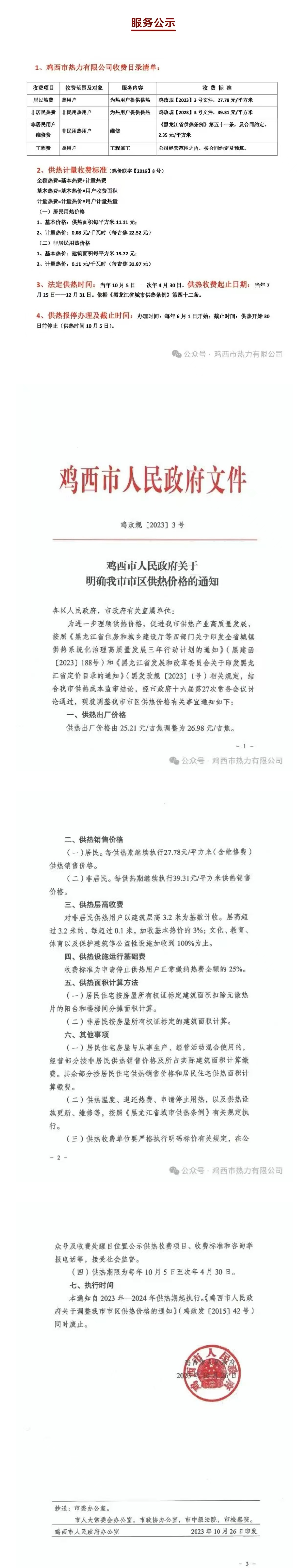 服務(wù)公示——附《雞西市人民政府關(guān)于明確我市市區(qū)供熱價格的通知》雞政規(guī)【2023】3號文件